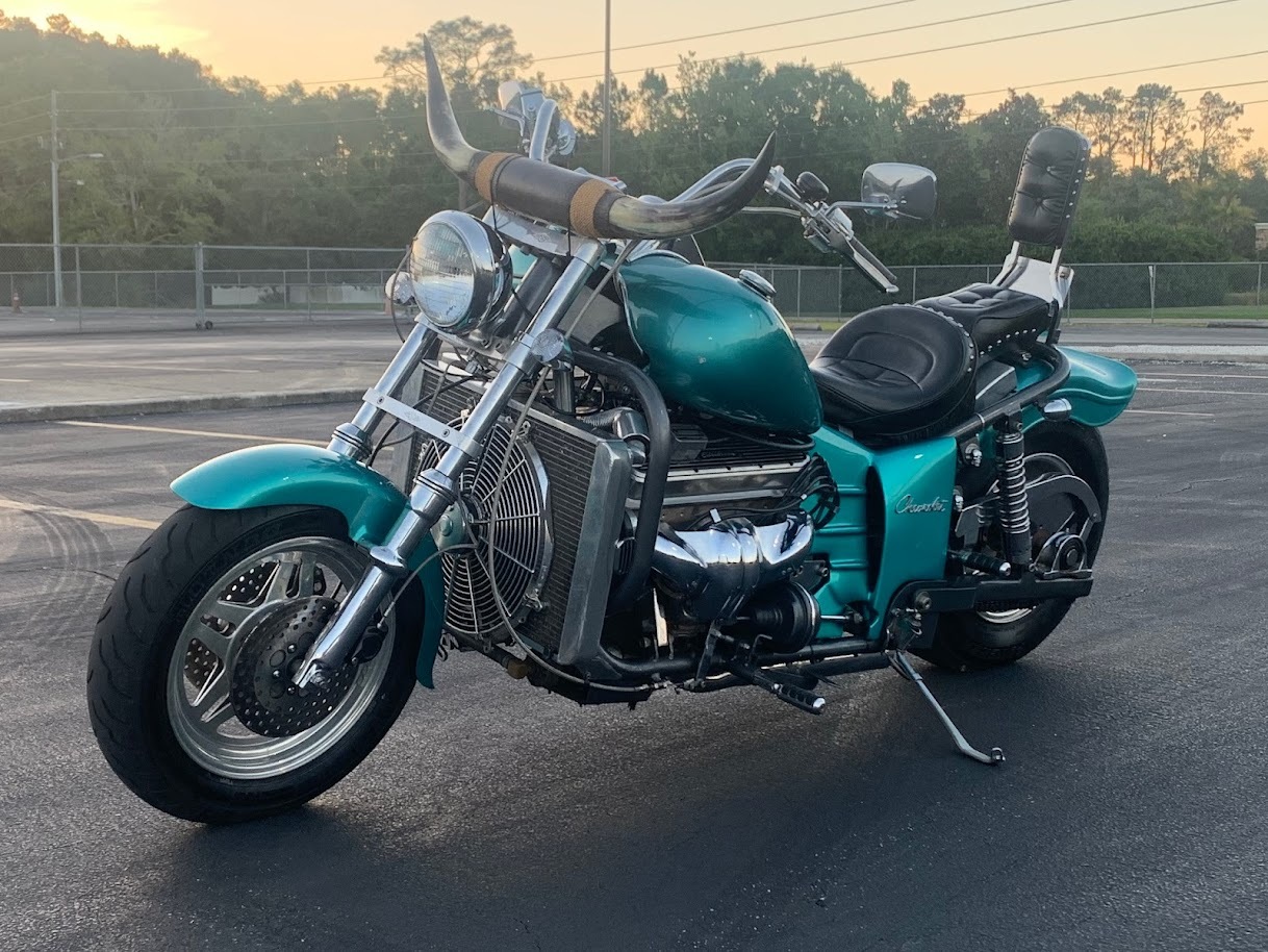 Morton has a background in aviation on the technical side and as a pilot. This bike is a xxxx Boss Hoss ZZ4 cammed 385hp engine with a 2 speed transmission and reverse. He built his first motorcycle powered by a Chevy V8.